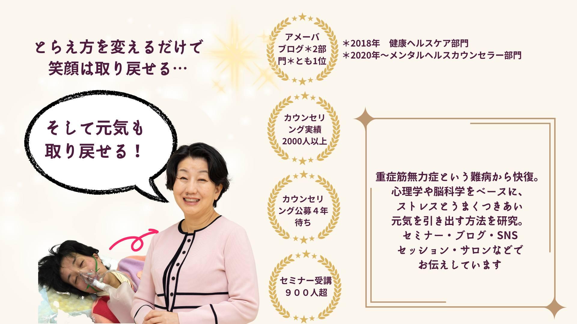 「この経験を、心身の不調など悩みに苦しむ人に届けたい!」—その思いから、アメーバブログで“災い転じて福にして、元気を最大限に引き出すメソッド”を発信。『健康・ヘルスケア』『メンタルヘルスカウンセラー』両部門で何度も1位獲得(最高PV:17985/日、156488/月)
