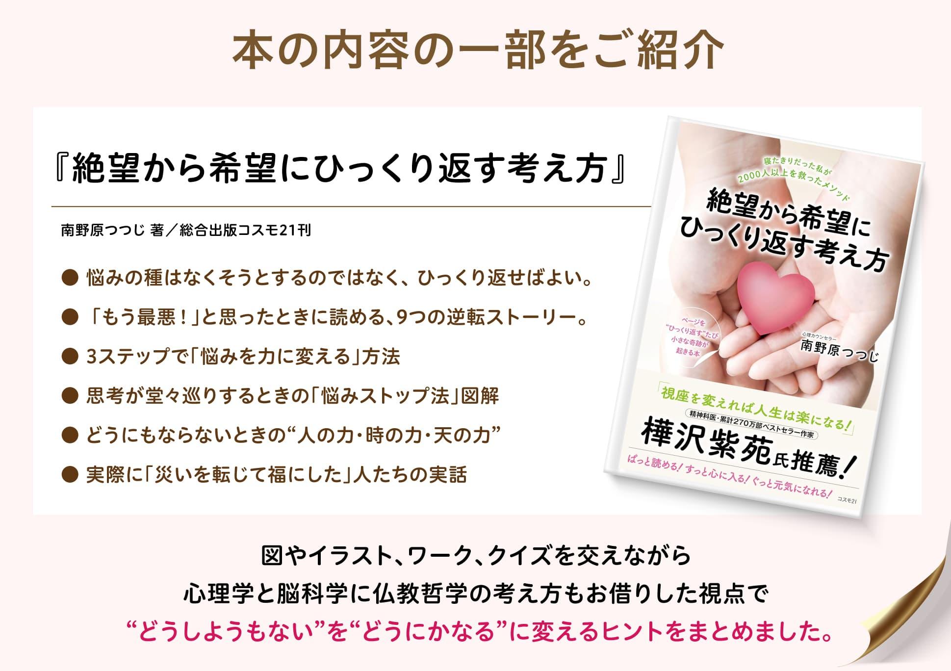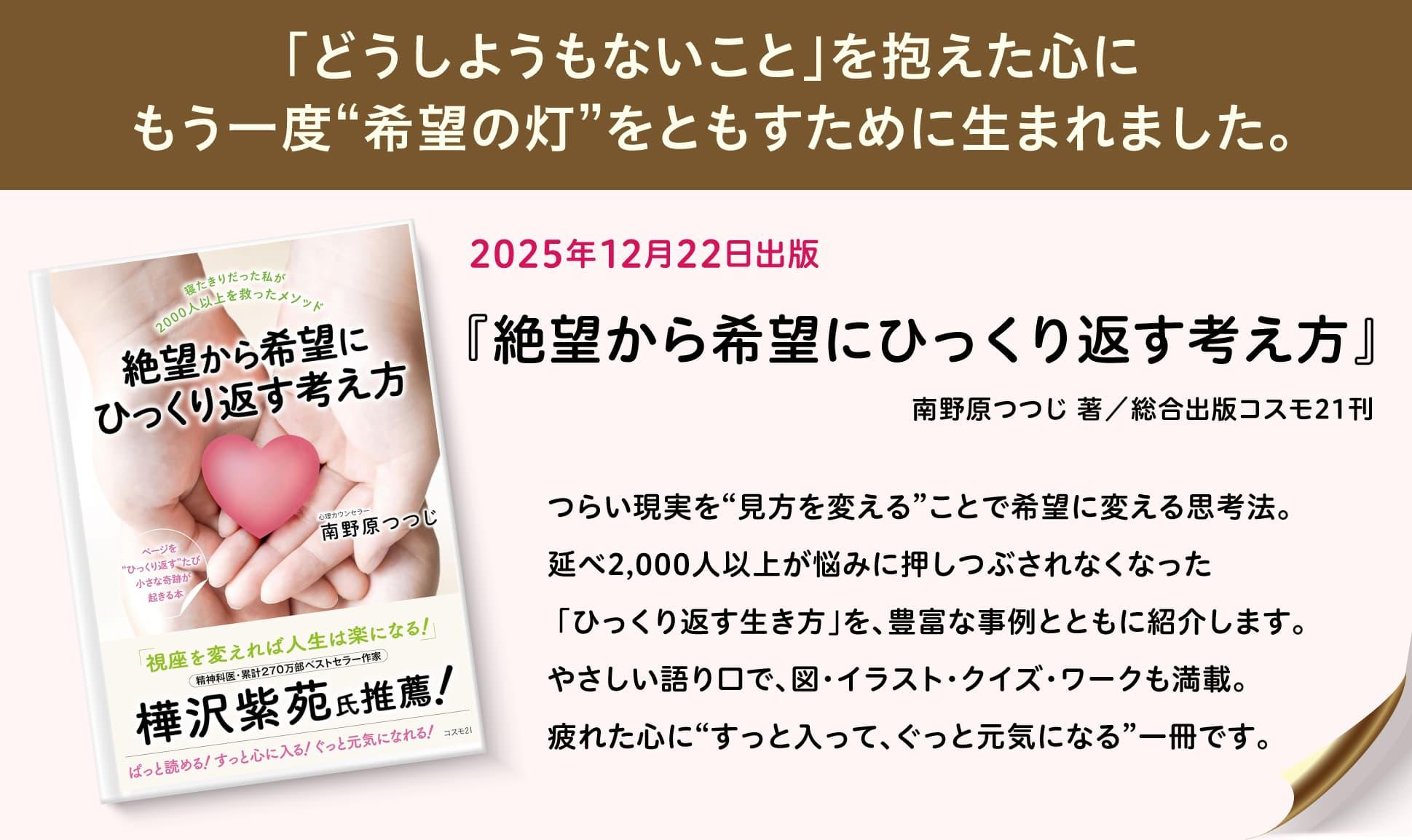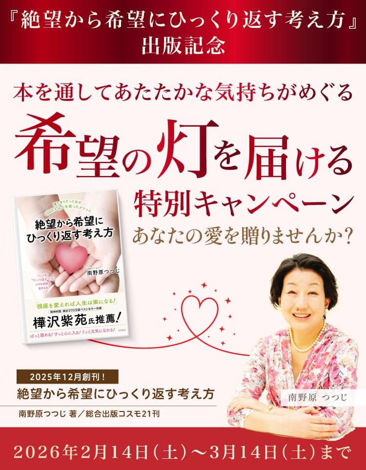 この大変な世の中を生きている大切なあなたのもとにも、転ばぬ先の杖として、これから何があっても大丈夫なように、この「絶望から希望にひっくり返す考え方」 南野原つつじ著/総合出版コスモ21刊 をお届けできれば幸いです。
