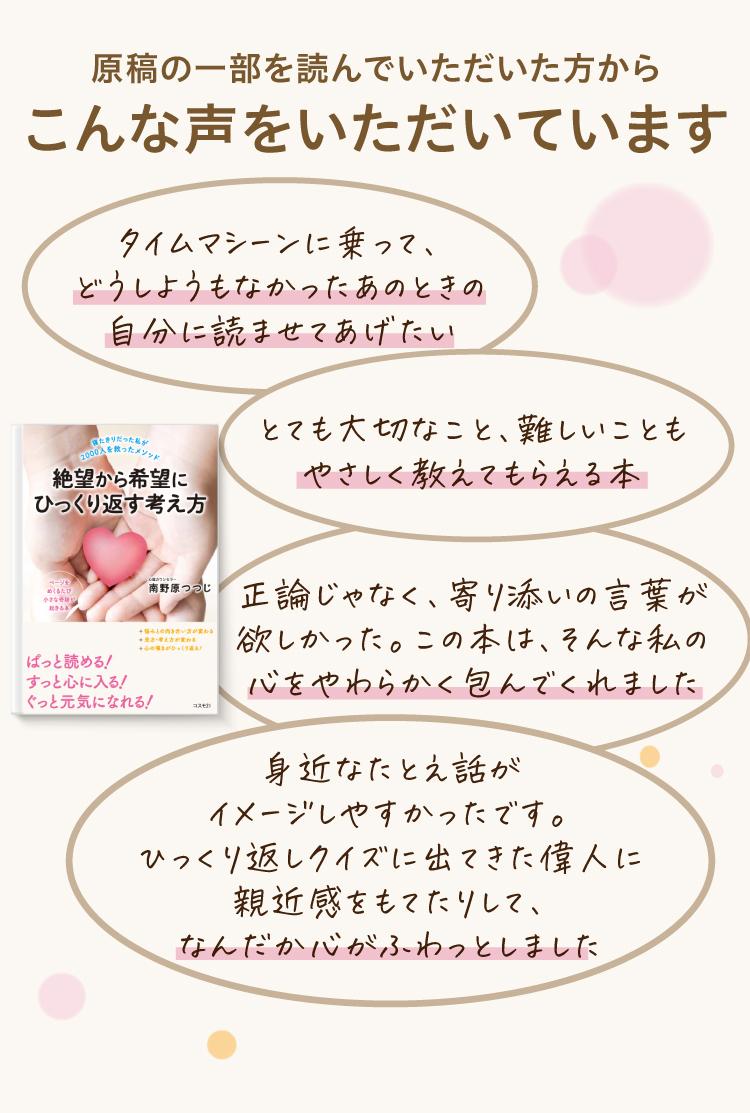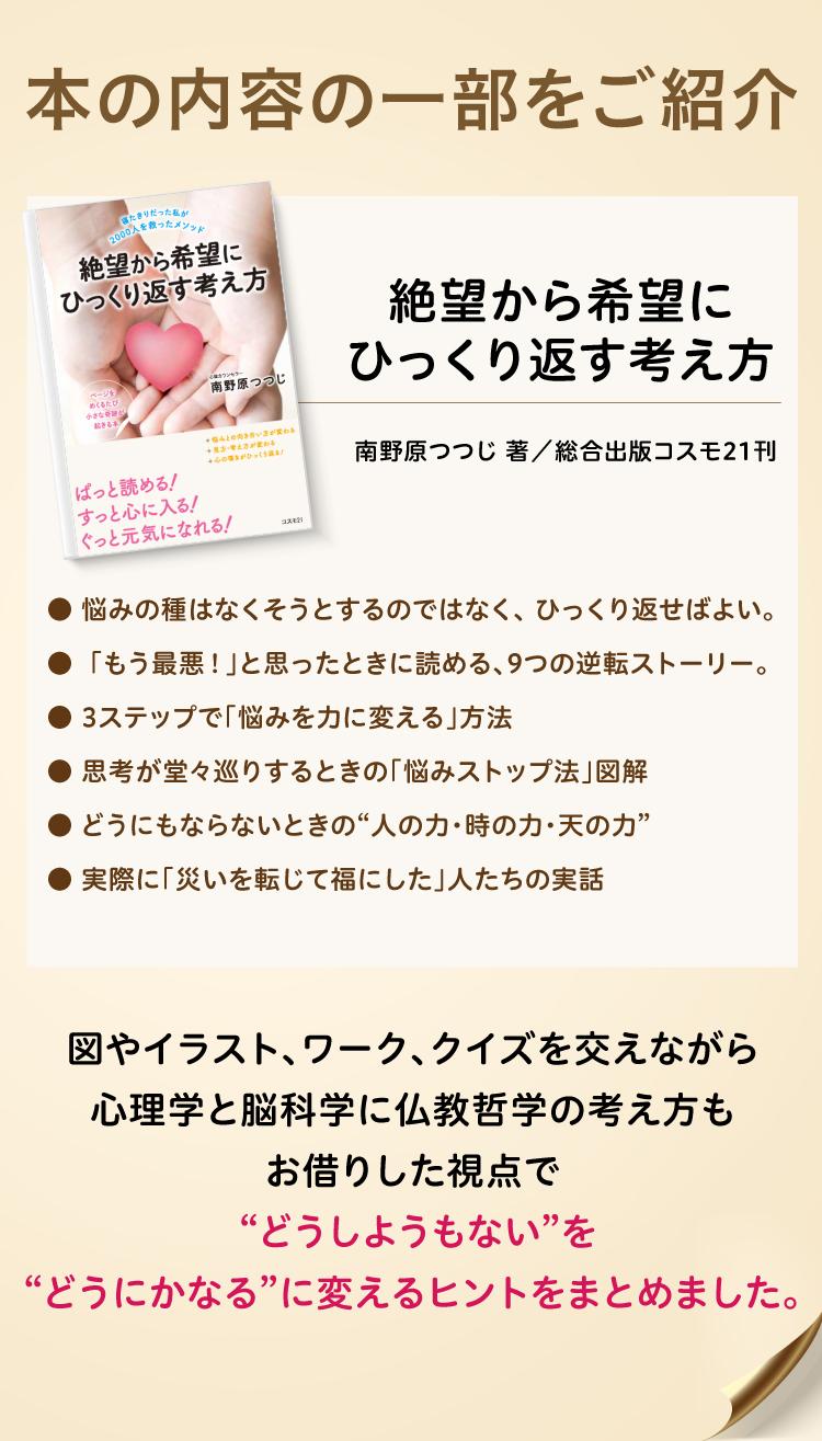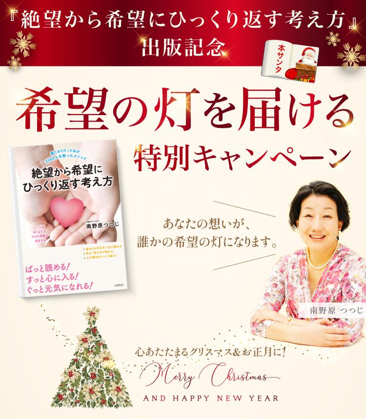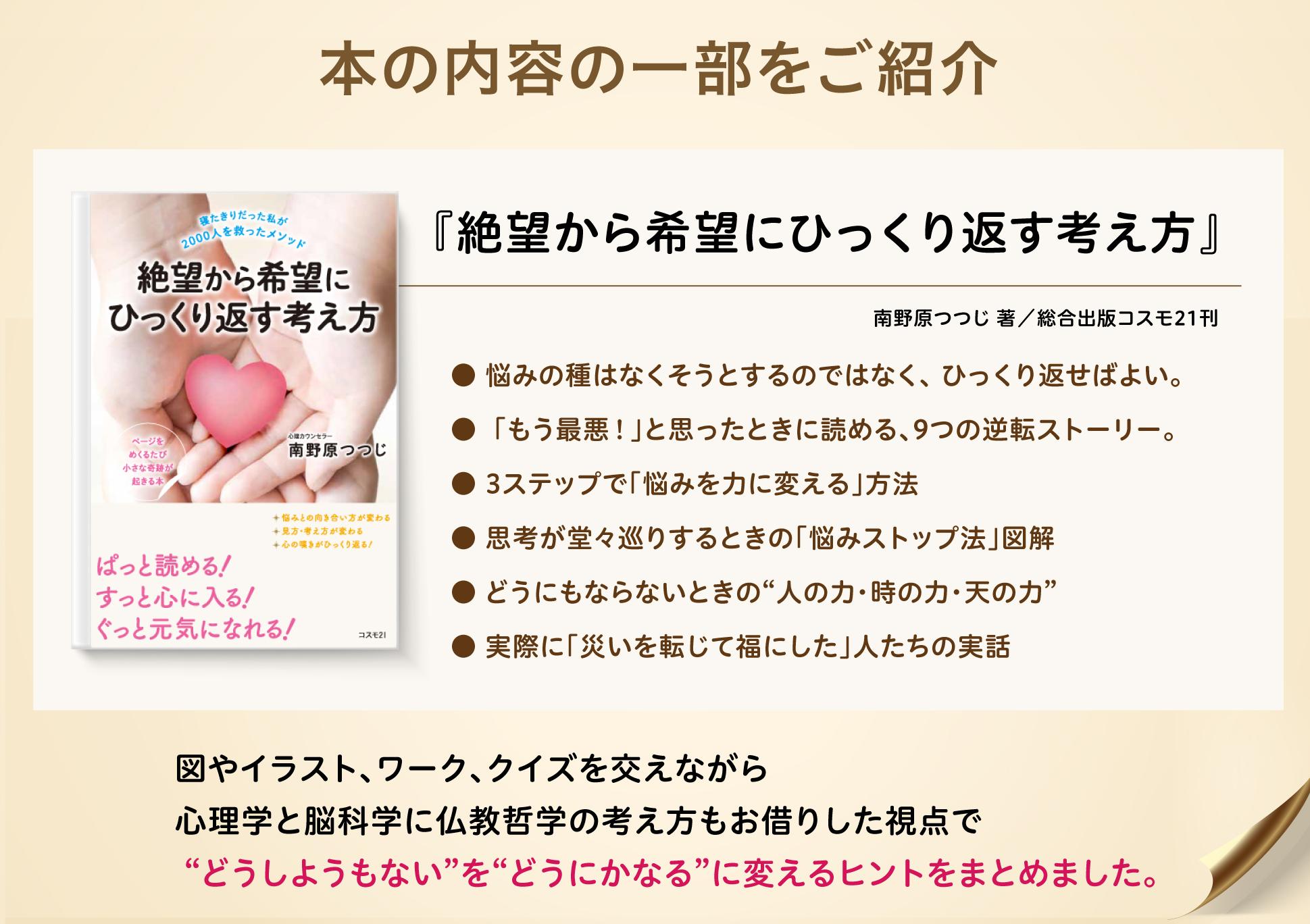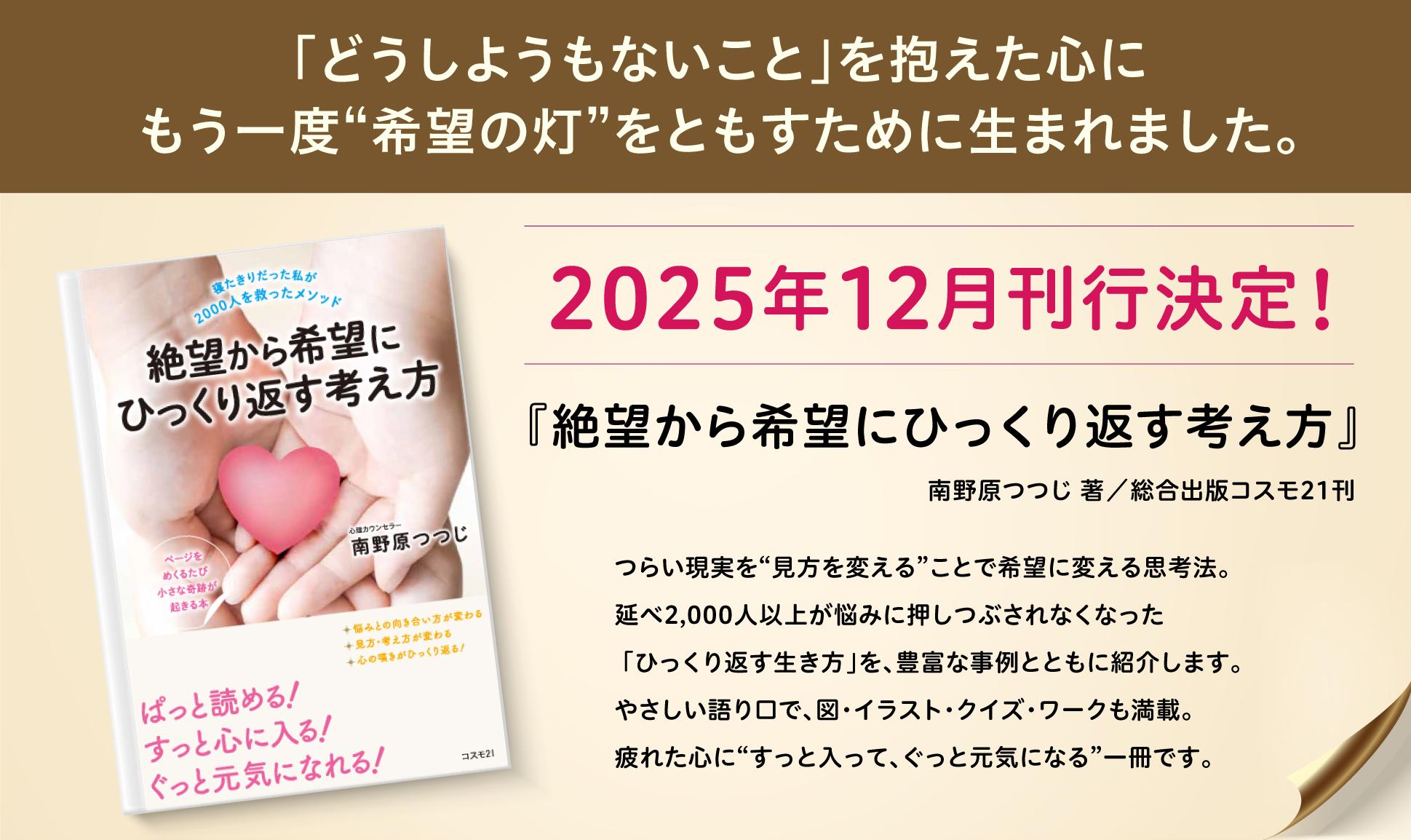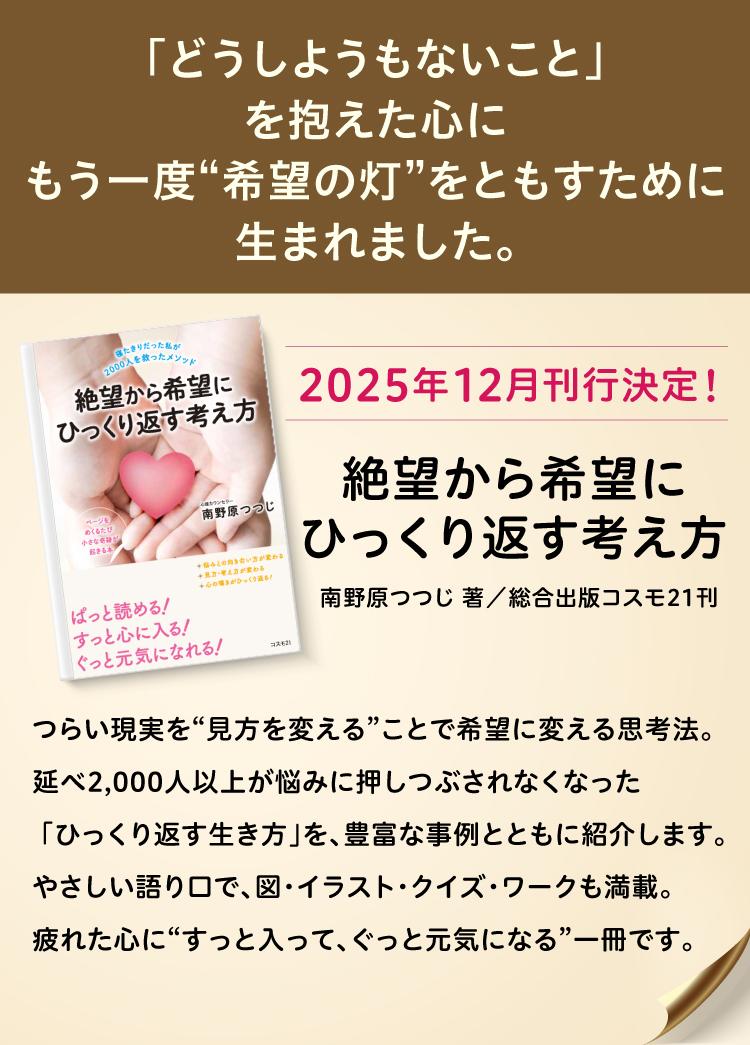 この大変な世の中を生きている大切なあなたのもとにも、転ばぬ先の杖として、これから何があっても大丈夫なように、この「絶望から希望にひっくり返す考え方」 南野原つつじ著/総合出版コスモ21刊 をお届けできれば幸いです。